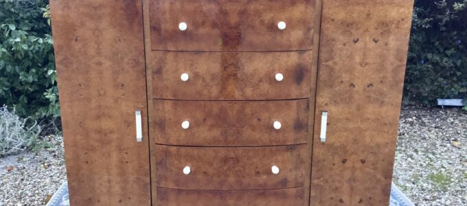 ‘); ?> Epoque: 20ème siècleStyle: Art DécoEtat: Parfait état Longueur: 160Hauteur: 130Profondeur: 50 Prix: 3.900 € 00 Magnifique meuble d’époque Art-Déco (fin des années 30) entièrement en loupe d’Amboine. Il ouvre par deux portes sur les côtés qui découvrent des rayonnages réglables sur crémaillères bois. Au centre cinq tiroirs aux dimensions généreuses. Les poignées et les boutons sont en ivoirine. Le…