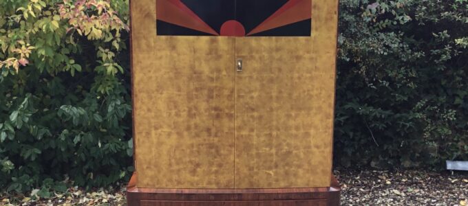 ‘); ?> Epoque: 20ème siècleStyle: Art DécoEtat: Parfait état Longueur: 160Hauteur: 130Profondeur: 50 Prix: 3.900 € 00 Magnifique meuble d’époque Art-Déco (fin des années 30) entièrement en loupe d’Amboine. Il ouvre par deux portes sur les côtés qui découvrent des rayonnages réglables sur crémaillères bois. Au centre cinq tiroirs aux dimensions généreuses. Les poignées et les boutons sont en ivoirine. Le…