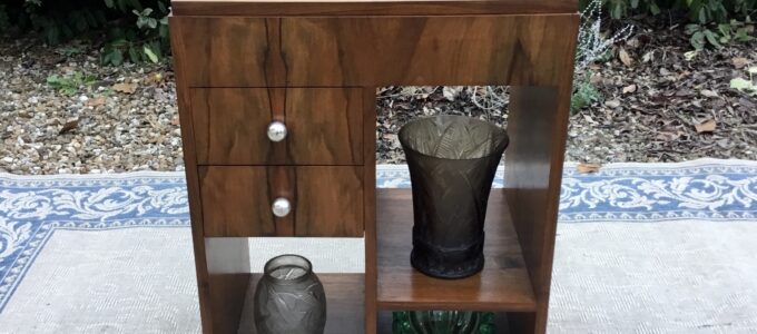 Epoque: 20ème siècleStyle: Art DécoEtat: Parfait état Matière: NoyerLongueur: 54Hauteur: 75Profondeur: 38 Prix: 840 € 00 Petit meuble composé d’un abattant, deux tiroirs et trois niches. Il est en très belle ronce de noyer. Les quatre faces sont présentables, ce qui en fait un petit meuble idéal en dos de canapé où en petite console dans une entrée. Boutons en bronze nickelé.