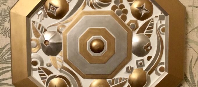 Epoque: 20ème siècleStyle: Art DécoEtat: Parfait état Diamètre: 61 Prix: 980 € 00 Superbe rosace Art-Déco montée en applique. Elle est en plâtre armé (très solide) et patinée à la dorure et à l’argenture pour créer un véritable tableau. Sur un support en bois, elle s’accroche au mur pour donner un éclairage indirect magnifique.