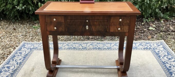 Epoque: 20ème siècleStyle: Art DécoEtat: Parfait état Longueur: 90Largeur: 45Hauteur: 77 Prix: 980 € 00 Console – bureau Art-Déco en noyer et ronce de noyer à piétements en U, reliés par une barre chromée . Cinq tiroirs et une tirette recouverte de cuir fauve ornent la façade. Le dessus en cuir fauve et liserés argentés présente quelques taches d’usage. Ce meuble…
