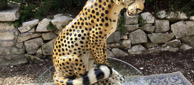 Epoque : 20ème siècle Style : Art Déco Etat : Parfait état Longueur : 48 Hauteur : 23 Profondeur : 18 Prix: 590 € 00 Originale panthère en céramique émaillée. Ce sujet présente une très belle finition avec une pâtine très originale et de jolies couleurs. Je lui trouve même un petit côté « rigolard » en regardant ce sur quoi elle va…