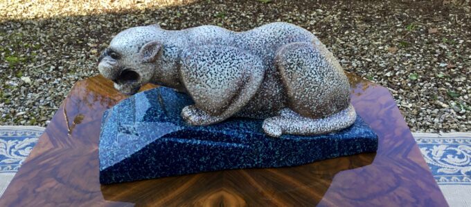 Epoque : 20ème siècle Style : Art Déco Etat : Parfait état Longueur : 48 Hauteur : 23 Profondeur : 18 Prix: 590 € 00 Originale panthère en céramique émaillée. Ce sujet présente une très belle finition avec une pâtine très originale et de jolies couleurs. Je lui trouve même un petit côté « rigolard » en regardant ce sur quoi elle va…
