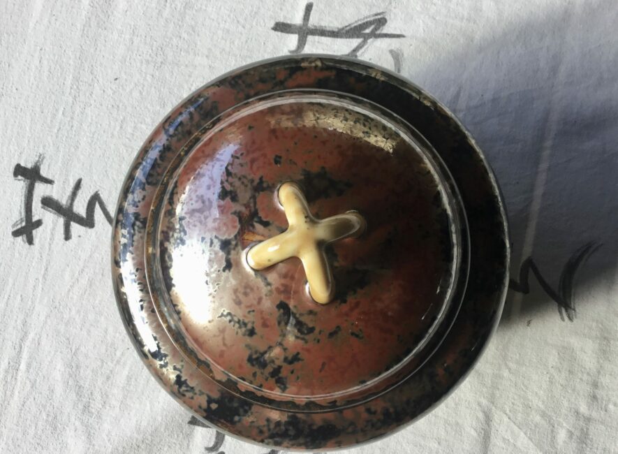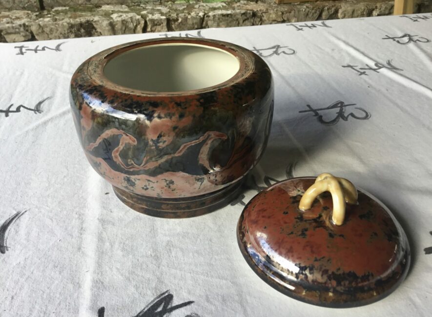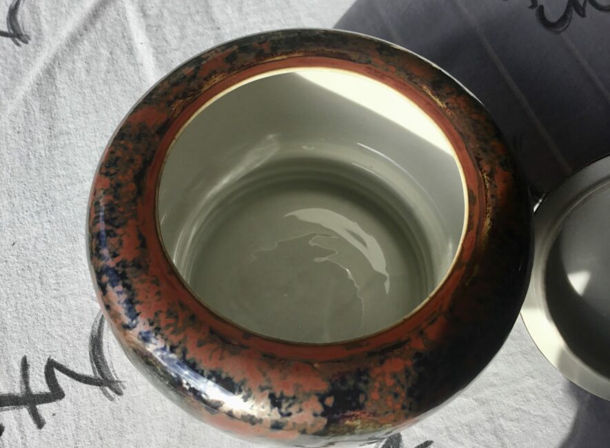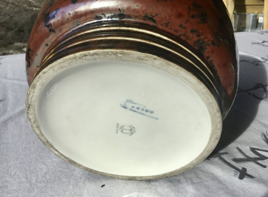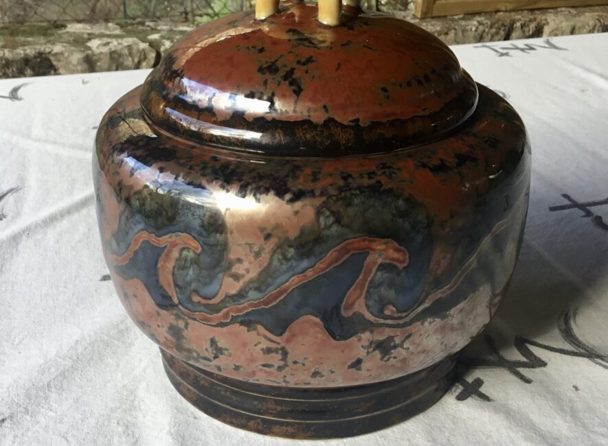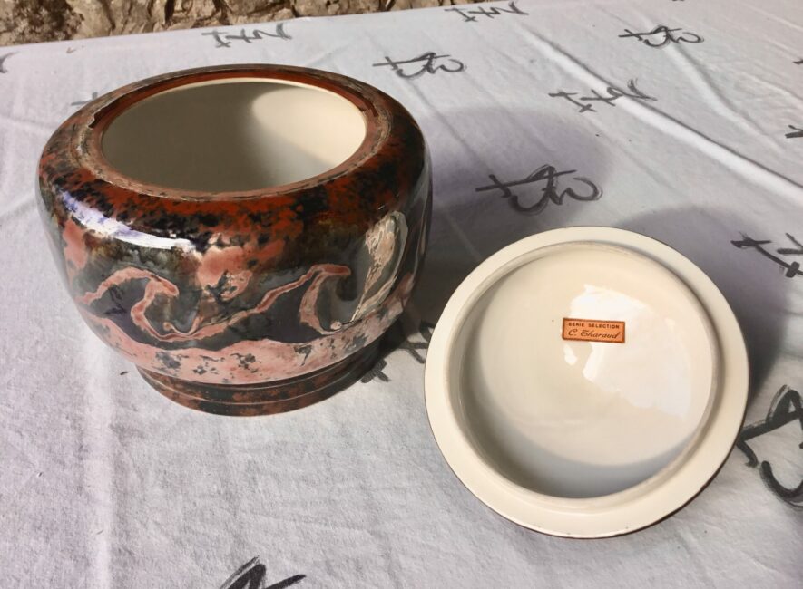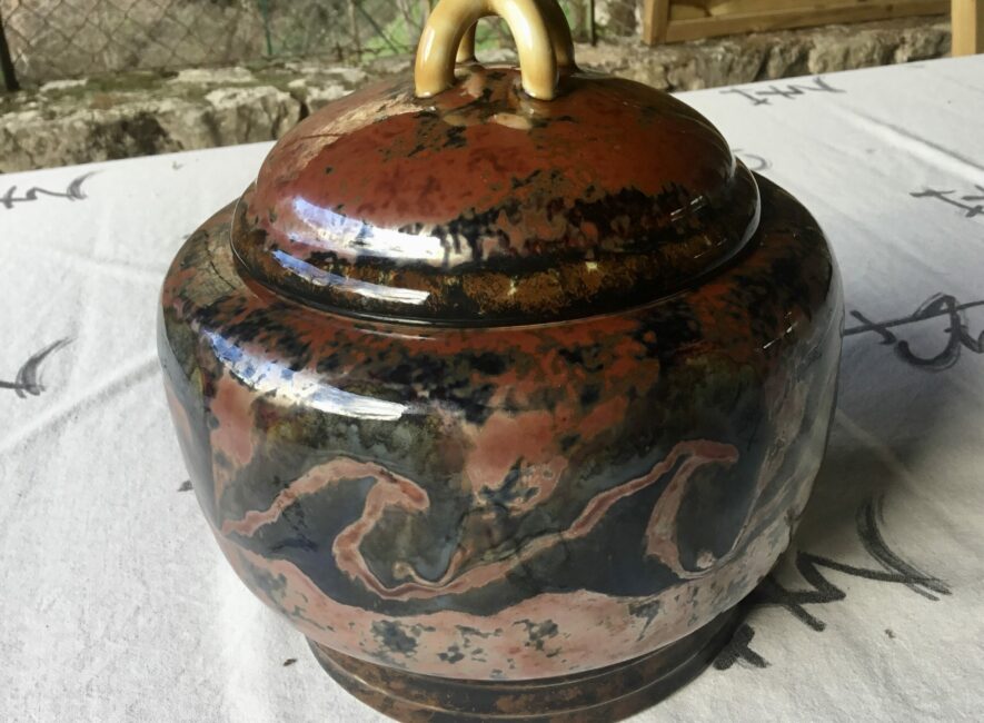 Exceptionnel grand pot couvert de Camille Tharaud. Dans les dominances de rouge feu qui sont les plus rares, et une irisation métallique, il est d’un grande qualité. C’est un modèle dont le dessin revient à son ami Henri Rapin qui lui dirigeait la manufacture de Sèvres. Il y avait à l’époque beaucoup de connections et d’échanges créatifs entre ces deux hauts lieux de la porcelaine.