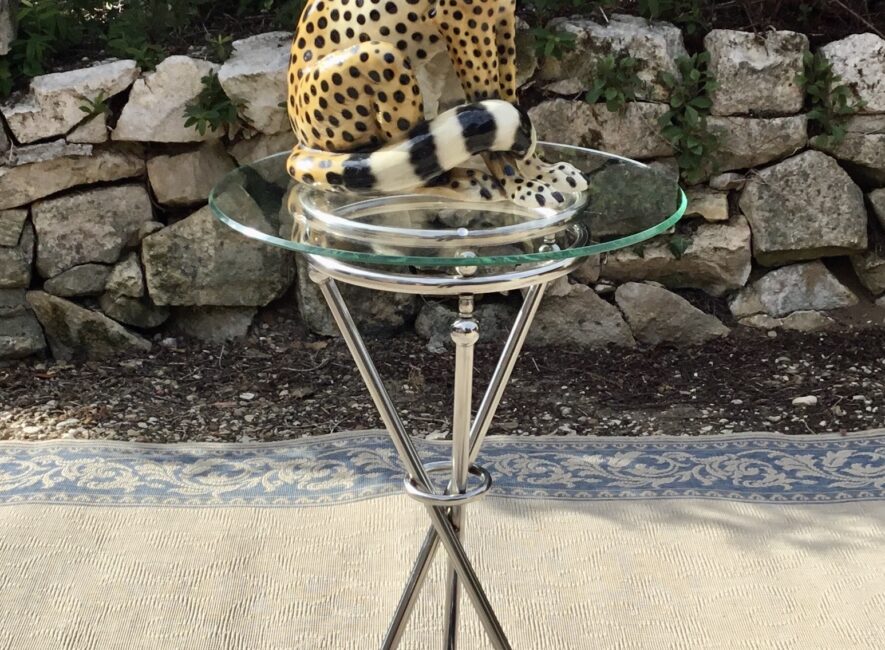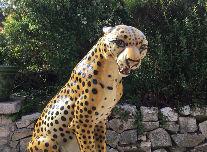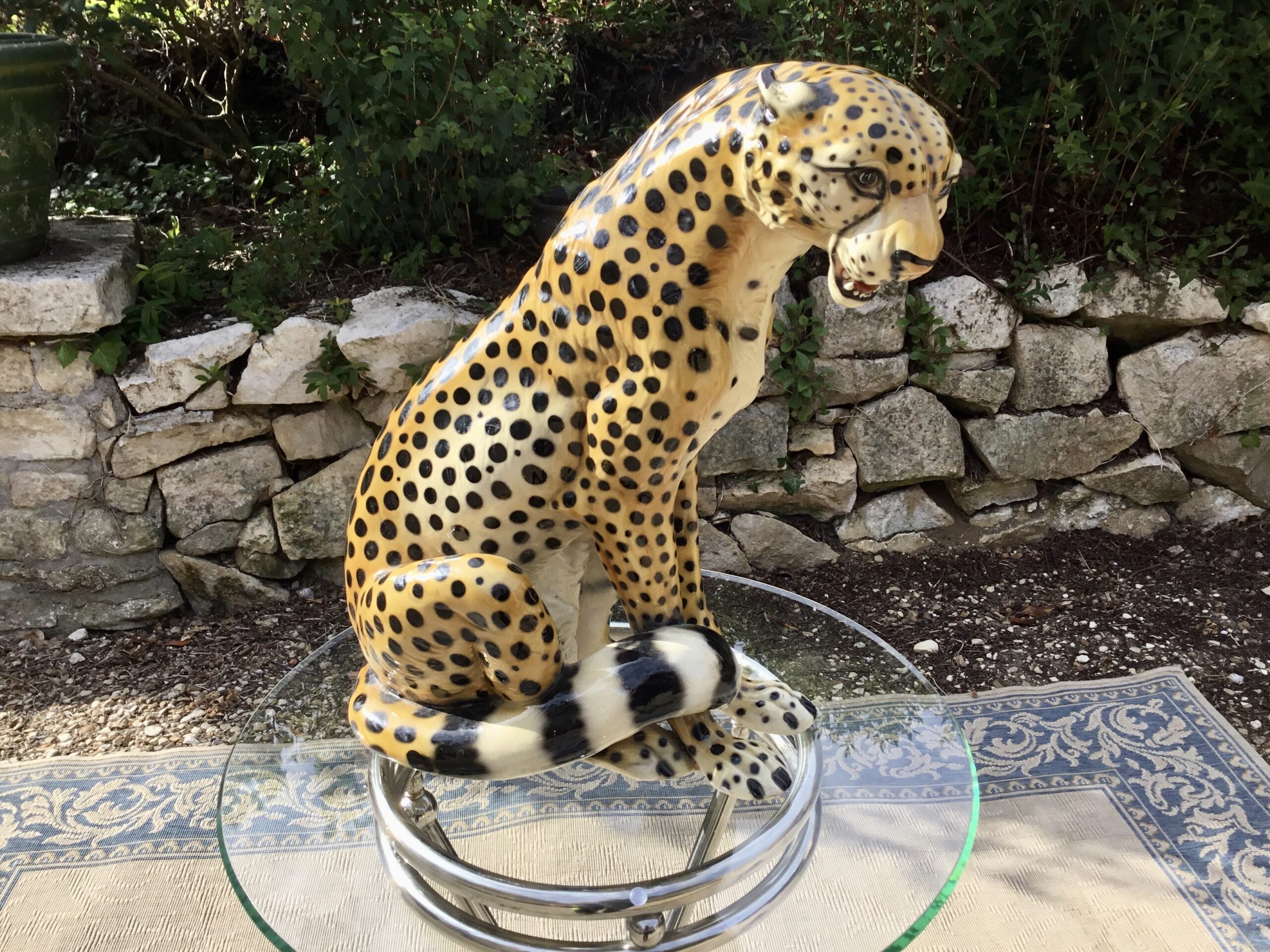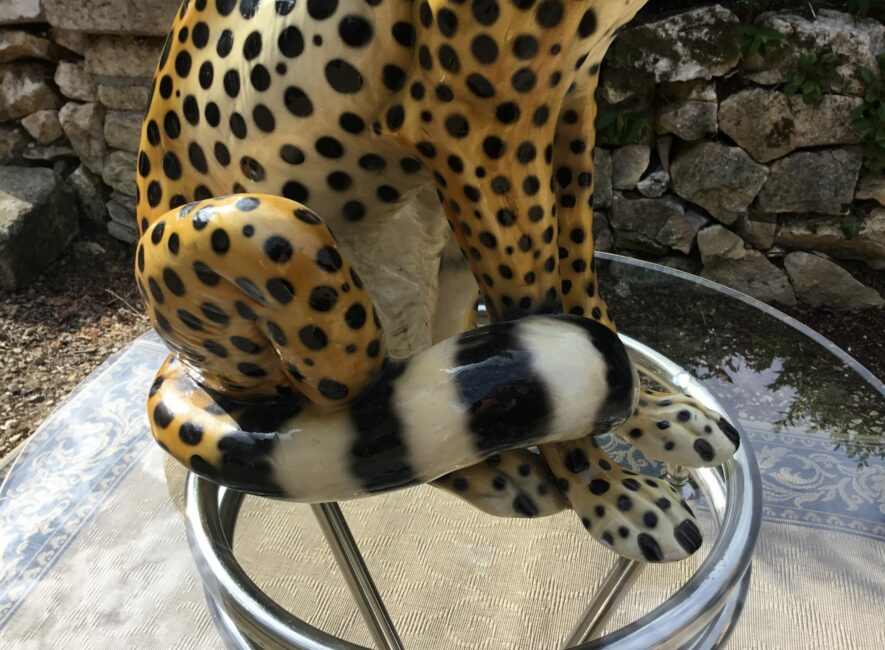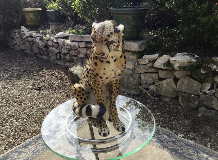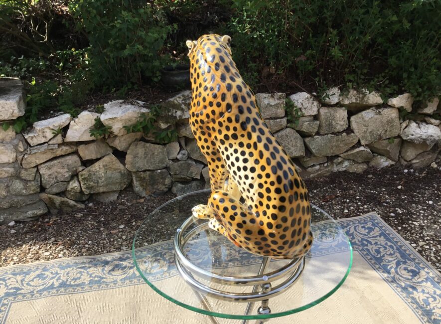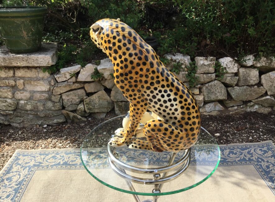 Belle et grande céramique peinte à la main et vernissée de Giovanni Ronzan (Italie) et datant des années 50-60. Elle représente un guépard assis. Très belle finition et positionpour cet animal. Giovanni Ronzan ouvre sa manufacture de céramique avec son frère en 1940 à Turin. Il participe à la décoration des plus grandes bijouteries avec ses beaux félins sortants de ses ateliers. Celle-ci est en parfait état et très décoratif et un des plus grands fabriqué par Ronzan.