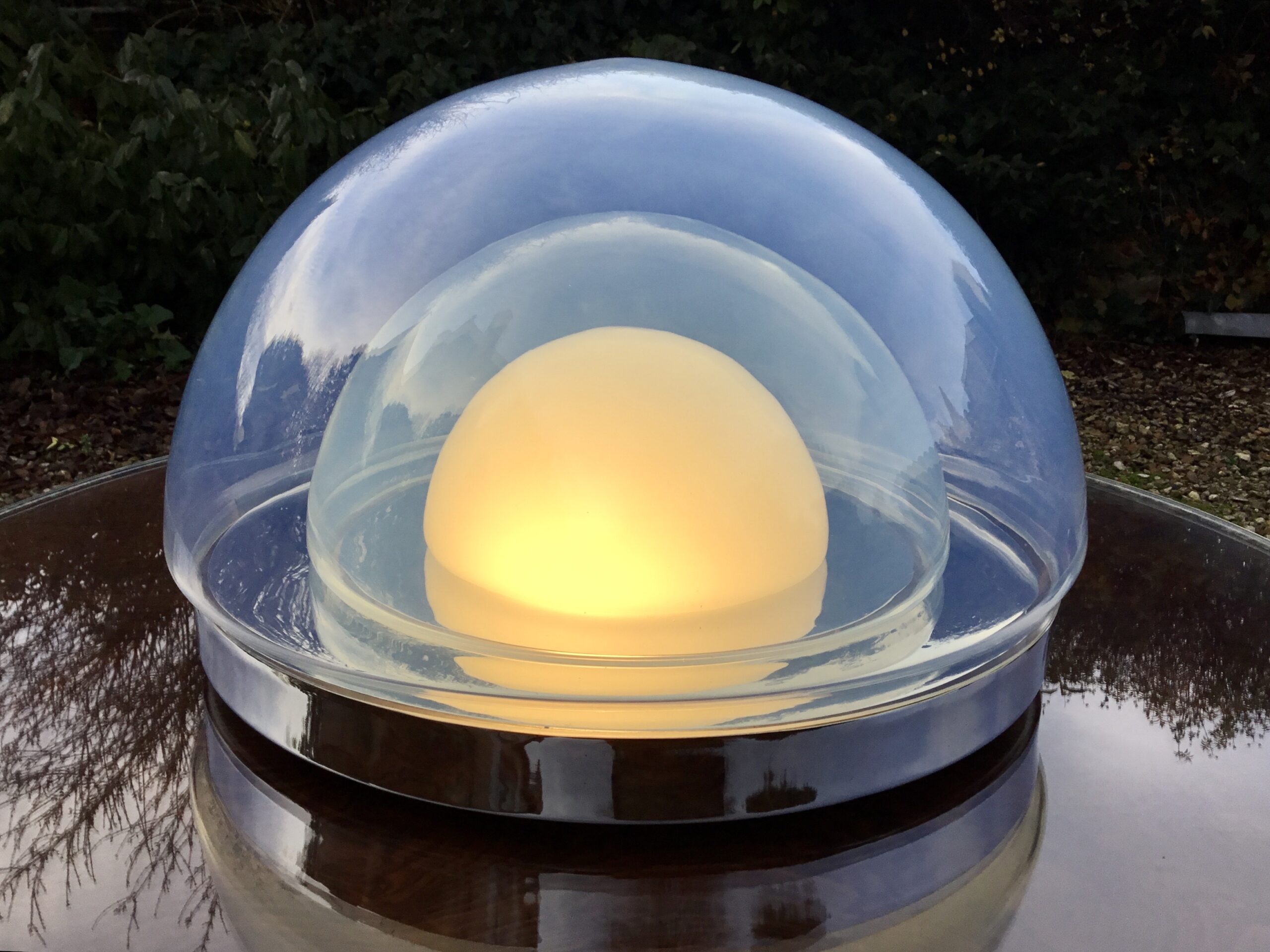 Rare lampe de table crée par Carlo Nason (Italie) en 1970 pour Mazzega éditions. Cette lampe achetée en 1973 est en parfait état. Elle comporte trois hémisphères en verre. Deux sont en verre opalin bleuté, et la troisième, la plus petite en opaline blanche afin de cacher l’ampoule et diffuser une douce lumière qui se diffuse au travers de tout ces globes. Le tout repose sur un socle en métal chromé avec deux disques dans lesquels s’encastrent les verreries. Quelques traces d’oxydations, mais invisibles puisque à l’intérieur. C’est une lampe magnifique qui donne une ambiance feutrée dans une pièce.