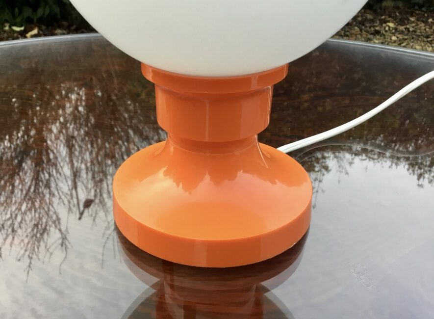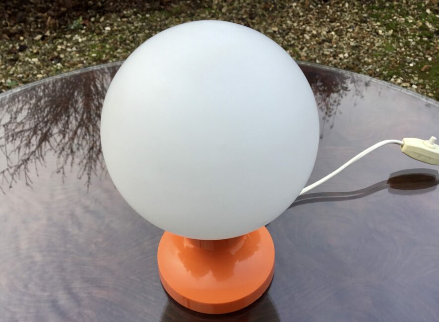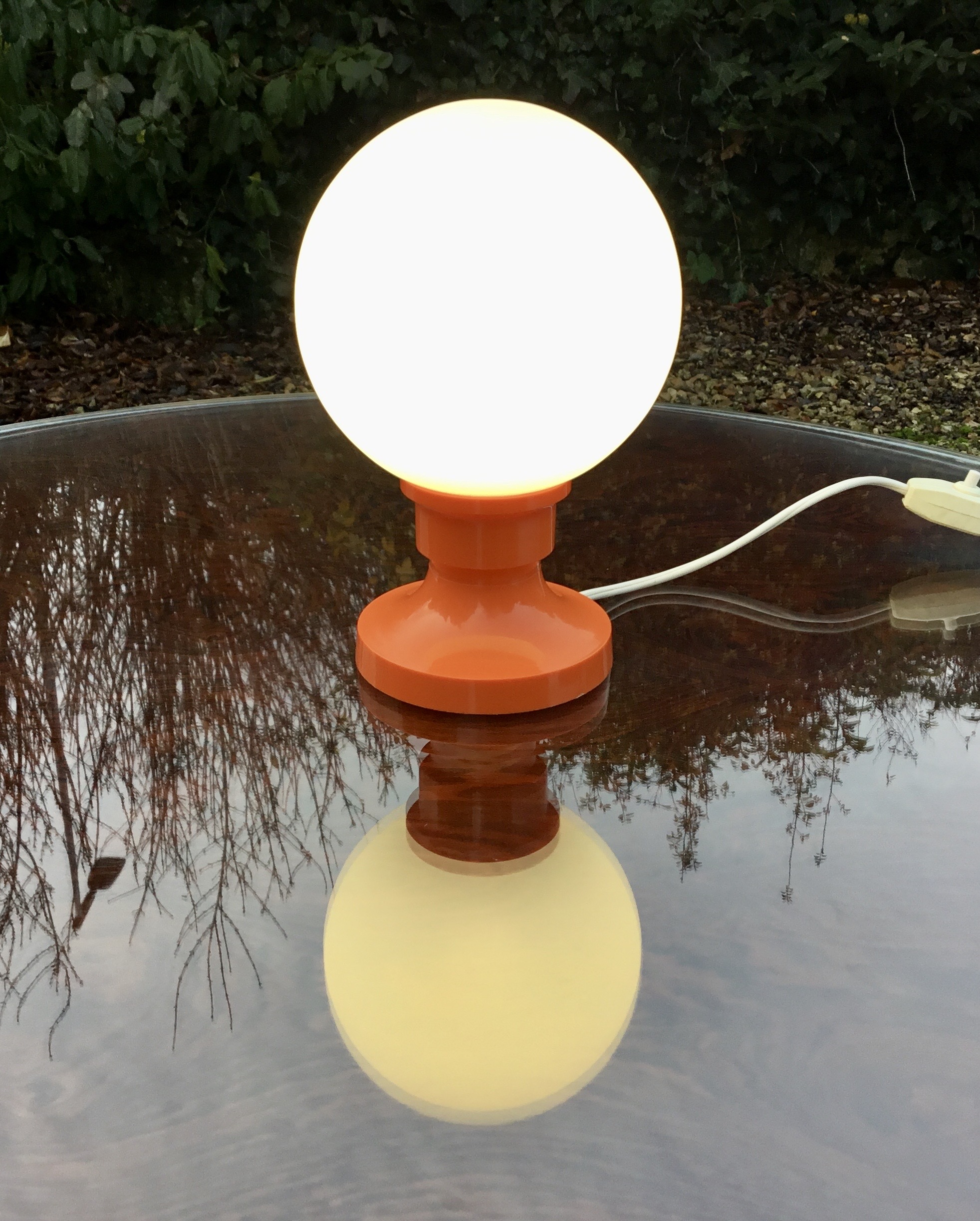 Petite lampe des années 70 en plastique orange avec une boule en verre dépoli. Elle est en parfait état de conservation.