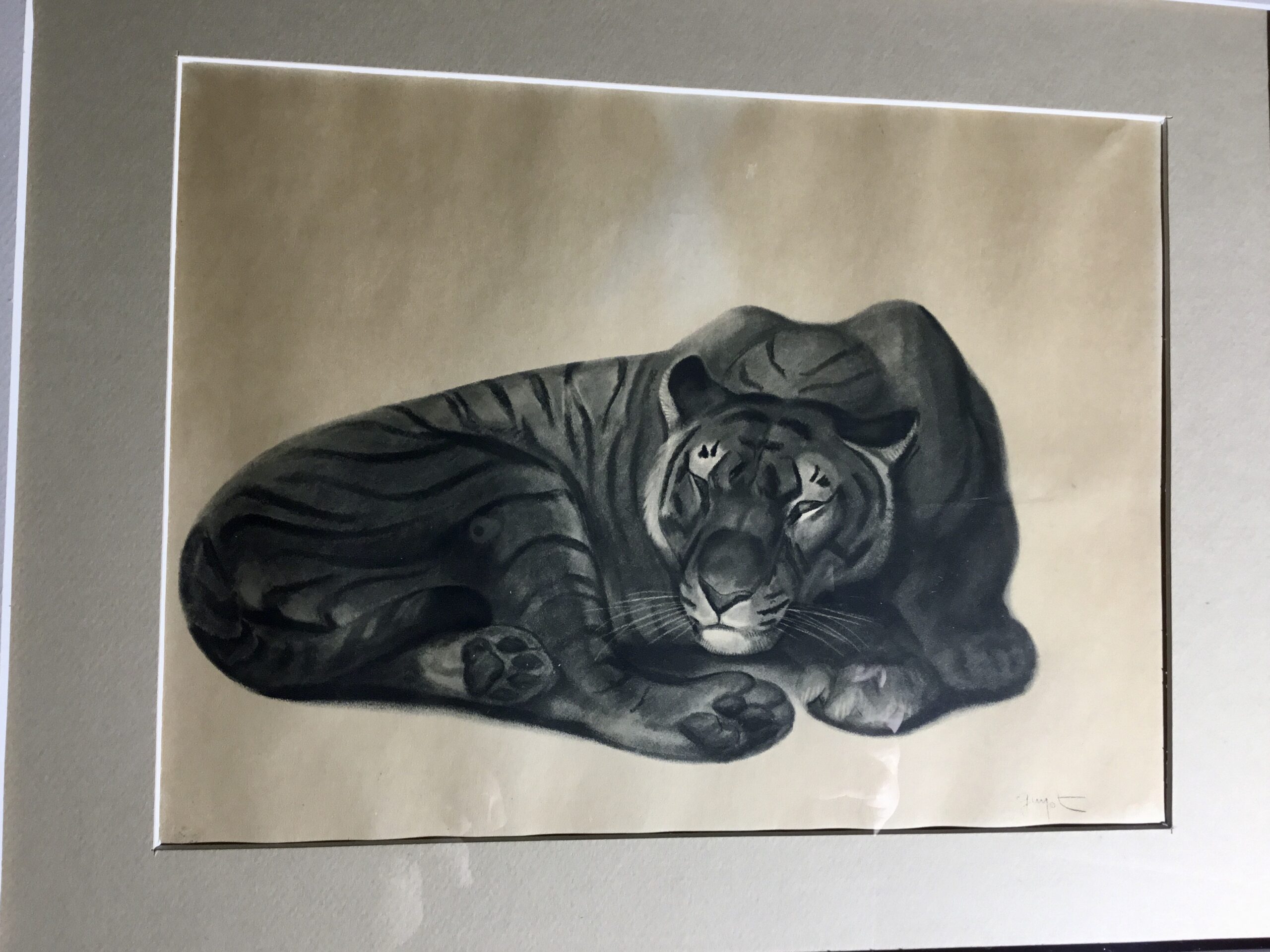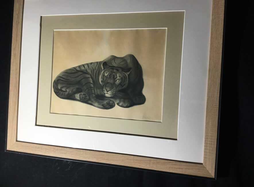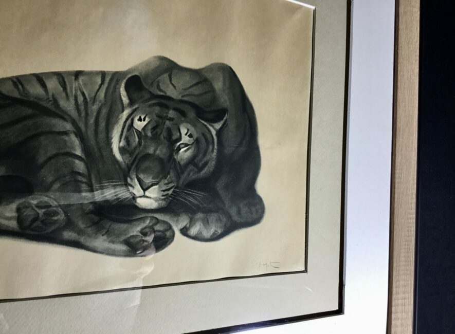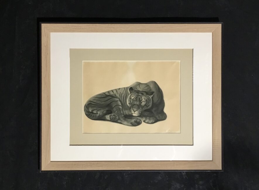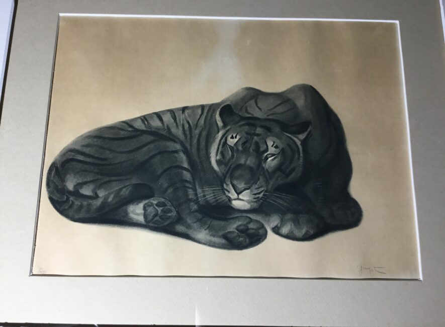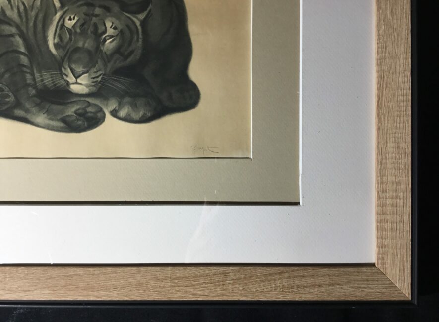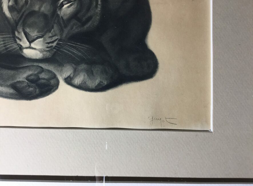 Jolie lithographie encadrée de Georges Guyot représentant un tigre au repos. Sur papier beige et en bon état, elle a été ré-encadrée. Georges Guyot (1885-1973) est un sculpteur, peintre et graveur animalier français dont l’œuvre exprime une profonde fascination pour le monde animal.