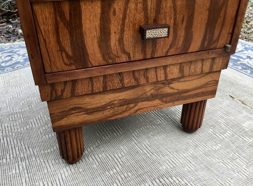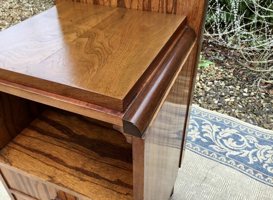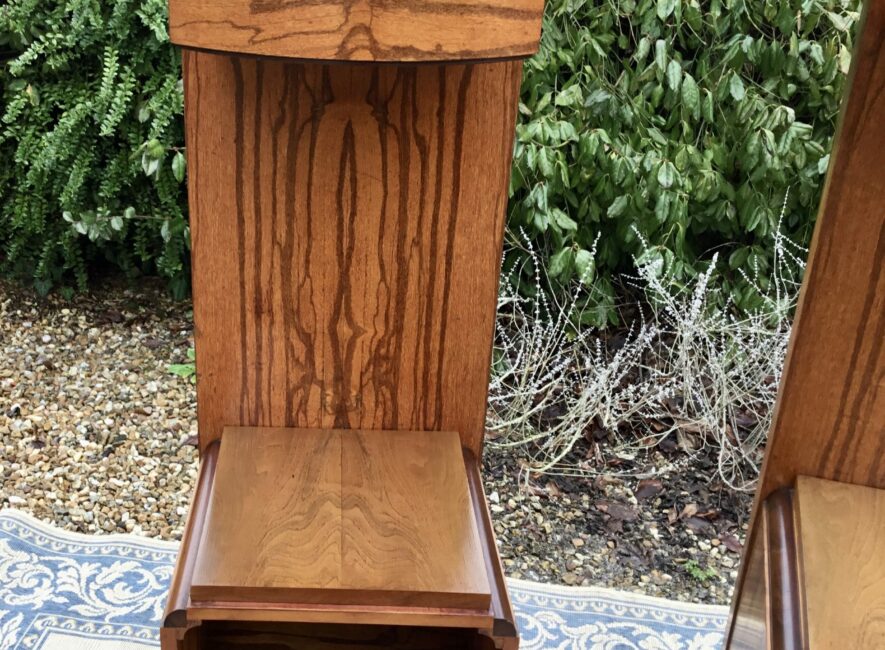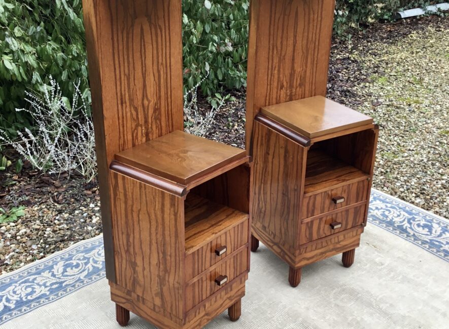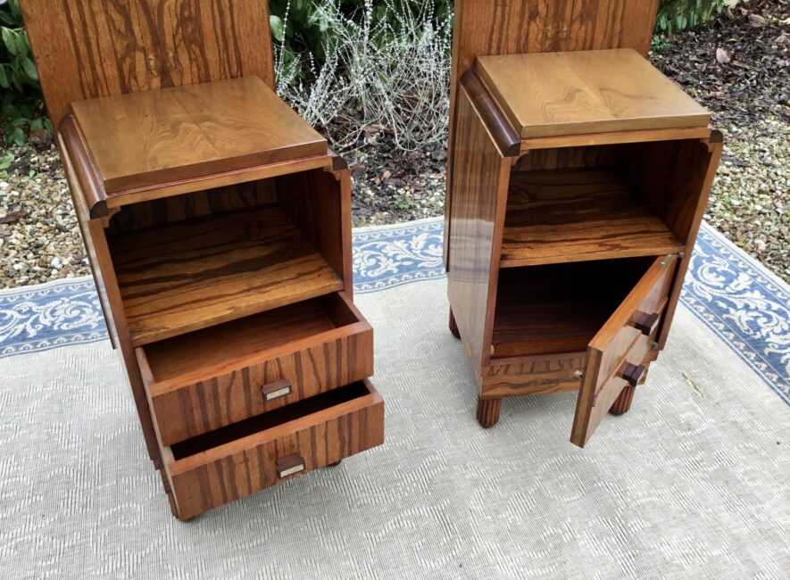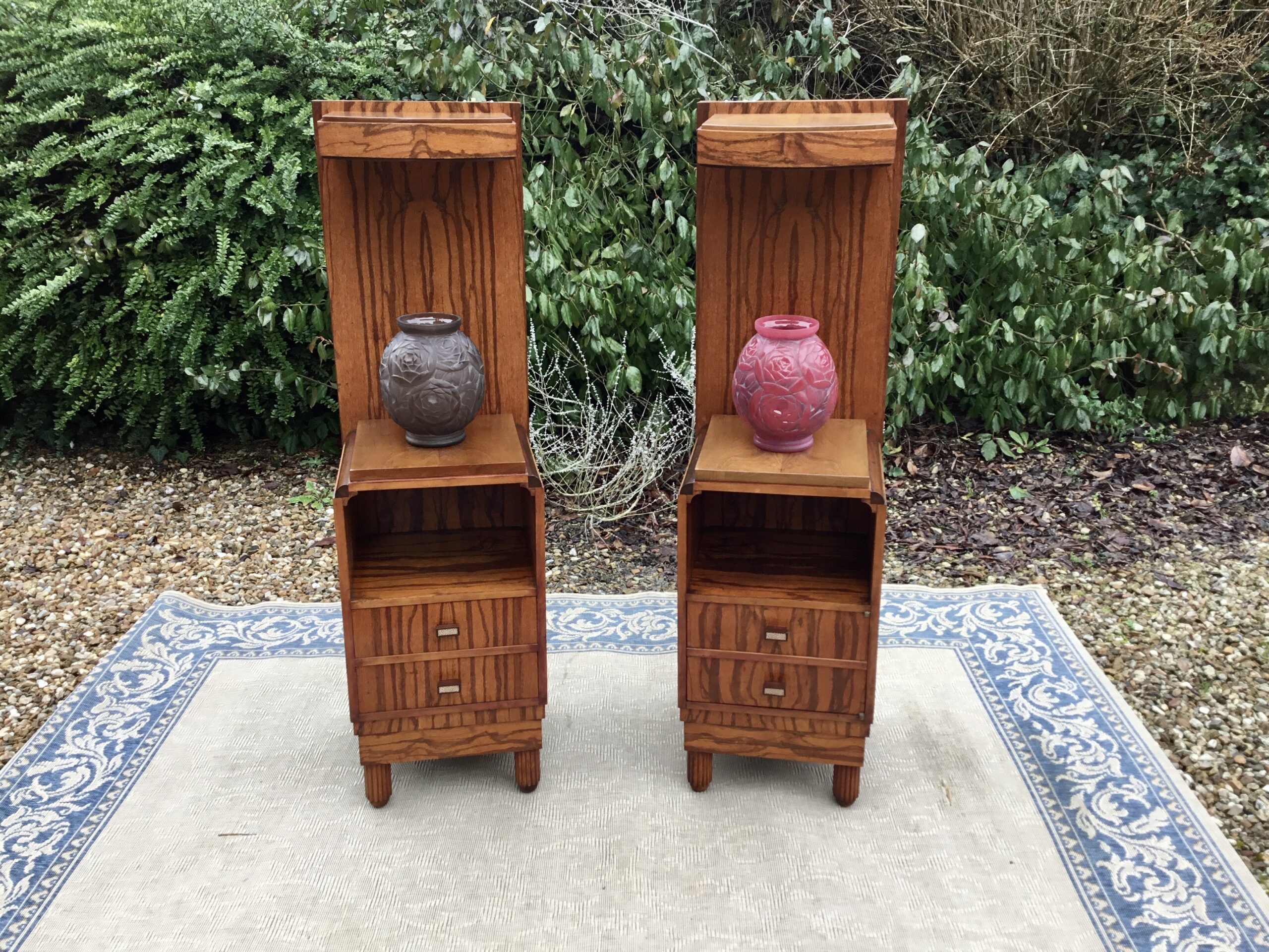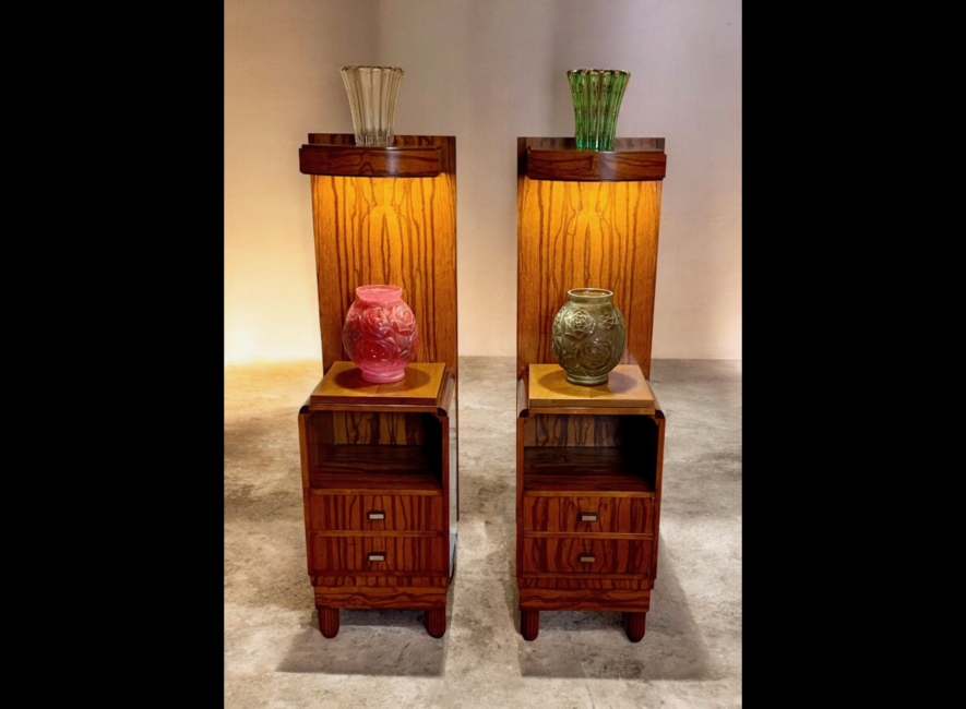 Rare paire de chevets Art-Déco comprenant un éclairage intégré. Ils sont en bois de serpent. C’est un bois originaire de Guyane, dont l’écorce identique à certains reptiles, leur permet de se dissimuler. Ils sont composés d’une niche avec pour l’un deux tiroirs en dessous et pour l’autre deux faux-tiroirs dissimulant une porte. Boutons en palissandre habillés de galuchat. Au dessus un fronton et une petite coupole pour l’éclairage. Boutons d’allumage d’origine, mais l’électricité a été entièrement refaite.