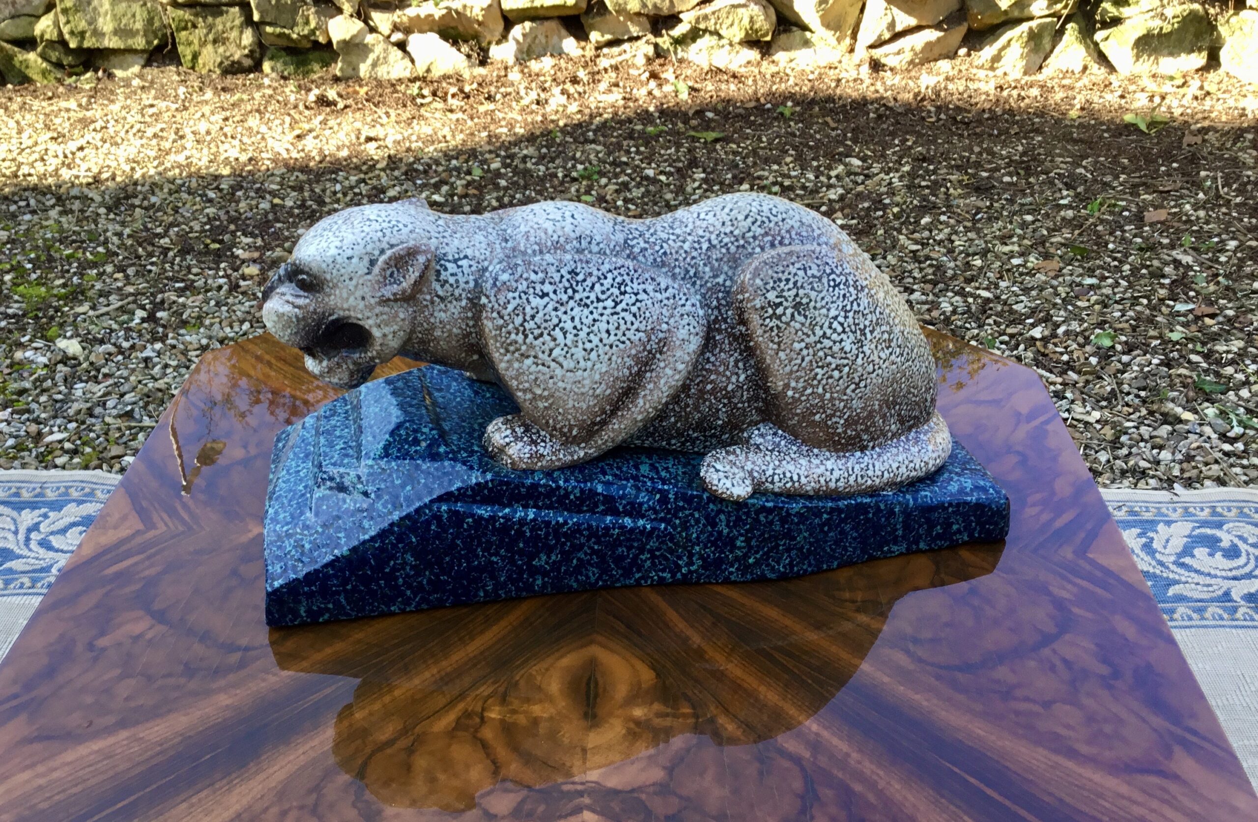 Originale panthère en céramique émaillée. Ce sujet présente une très belle finition avec une pâtine très originale et de jolies couleurs. Je lui trouve même un petit côté « rigolard » en regardant ce sur quoi elle va bondir. Probablement originaire de Saint Clément.