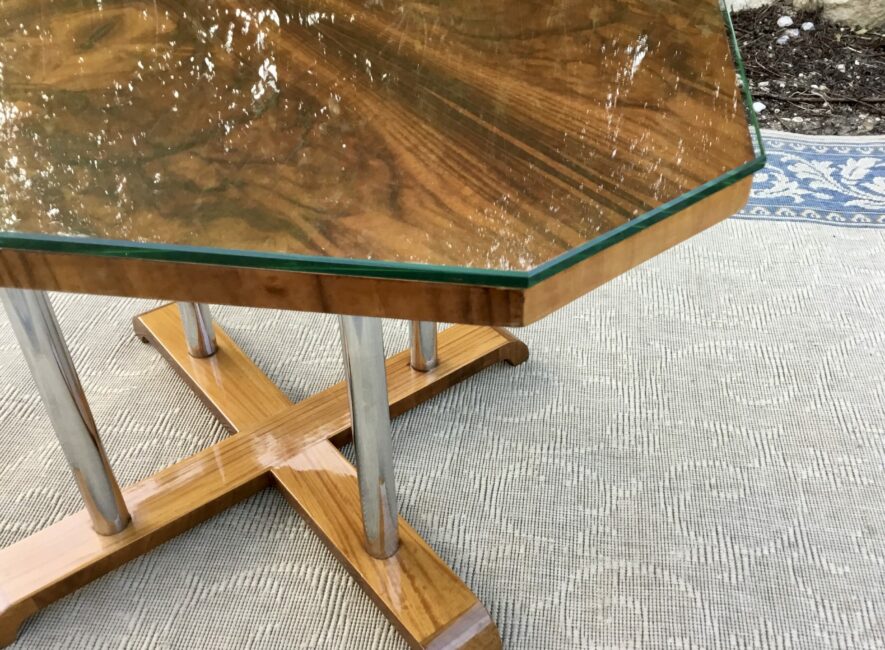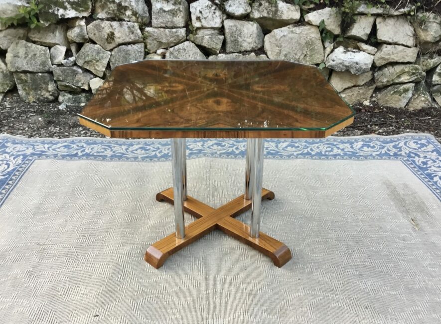 Table basse Art-Déco avec un plateau impressionnant. ( même le chat l’a trouvé belle)………Il est fait d’un assemblage de ronce de noyer dit en « aile de papillon ». Il repose sur quatre tubes en métal chromé et se termine par un piétement en X. On peut remarquer sur le pied et sur les petits angles du plateau un placage de citronnier qui donne à cette table de salon une allure moderniste. J’ai rajouté une dalle de verre sur mesure de 8 m.m, afin de pouvoir s’en servir sans aucunes craintes.