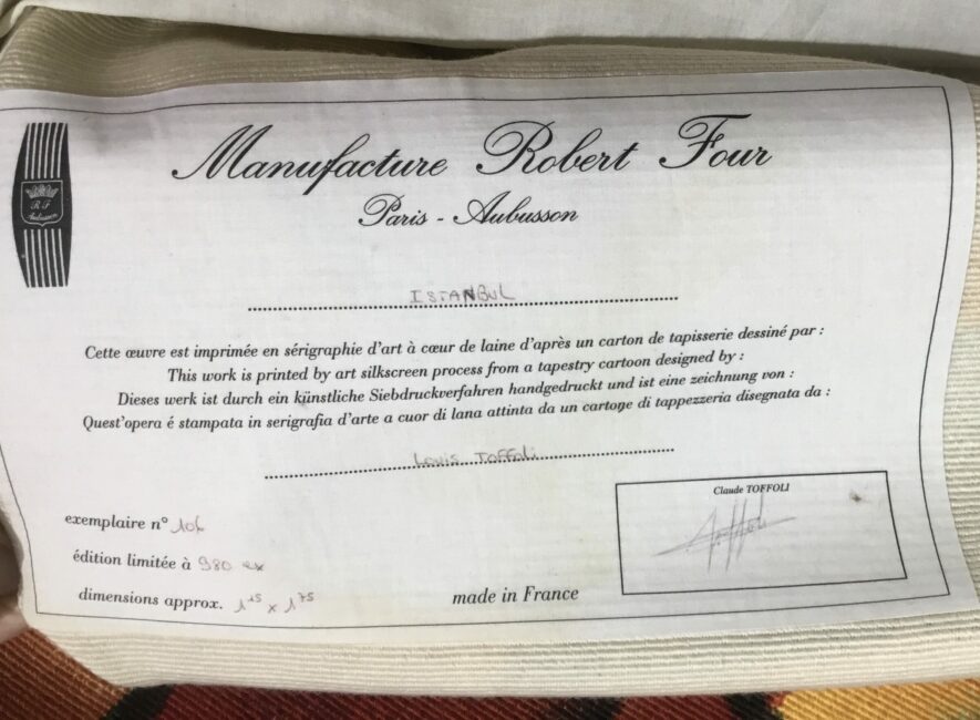 Magnifique tapisserie d’Aubusson de Robert Four sur une peinture de Louis Toffoli (1907 – 1999). Il s’agit d’une sérigraphie cœur de laine qui est d’une superbe luminosité. Contrairement à beaucoup sur le marché, cette tapisserie ne présente aucunes traces de décoloration.