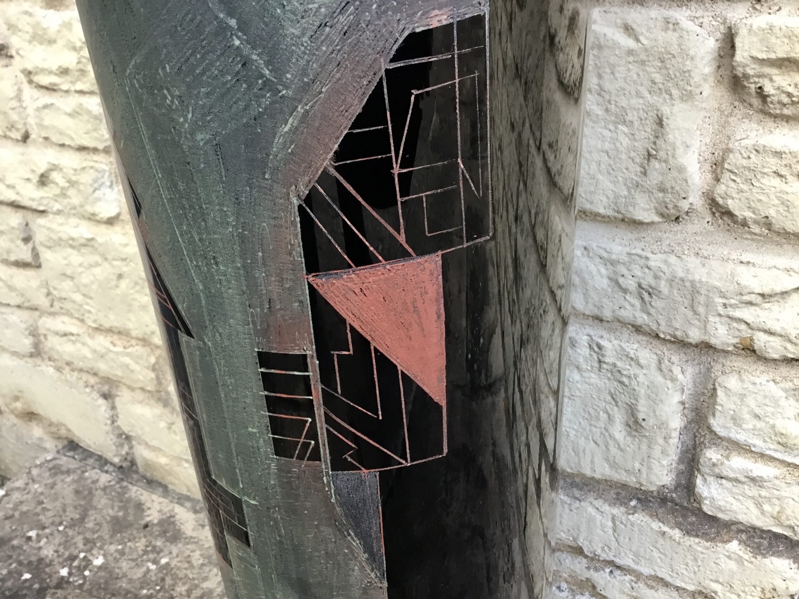 Très important vase tubulaire en verre opalin noir d’Anatole Riecke. Ses décors géométriques modernistes stylisés noir et rouge.