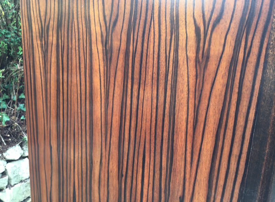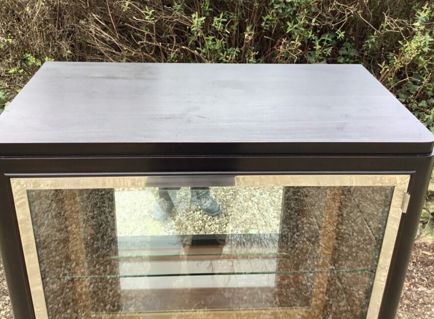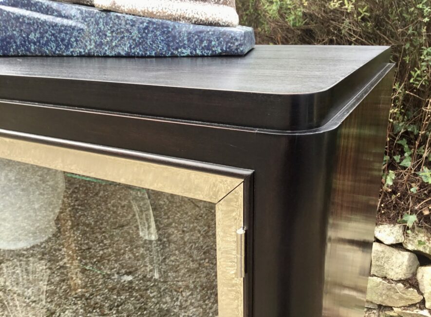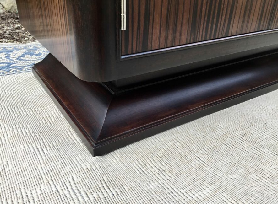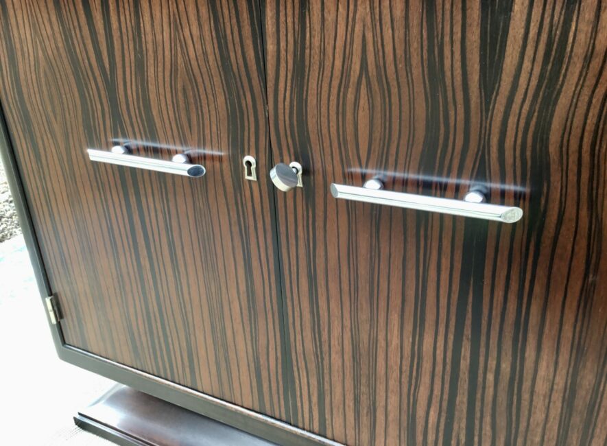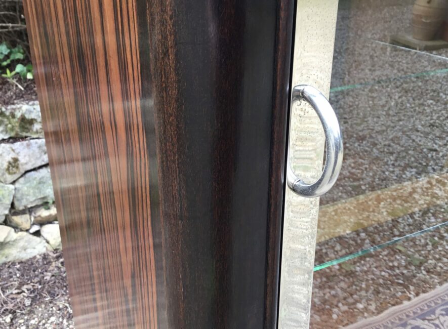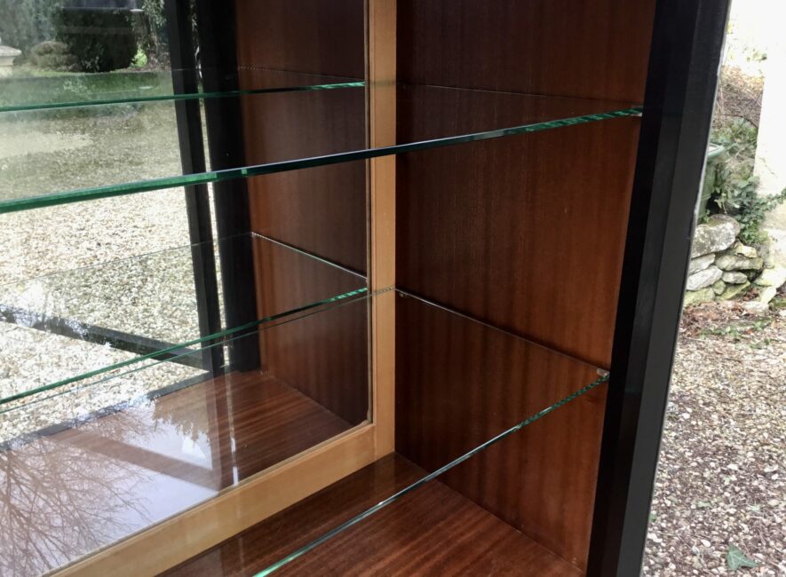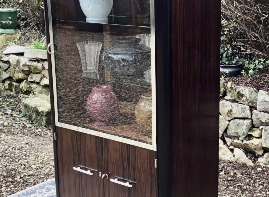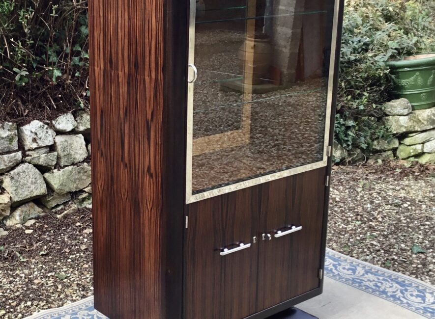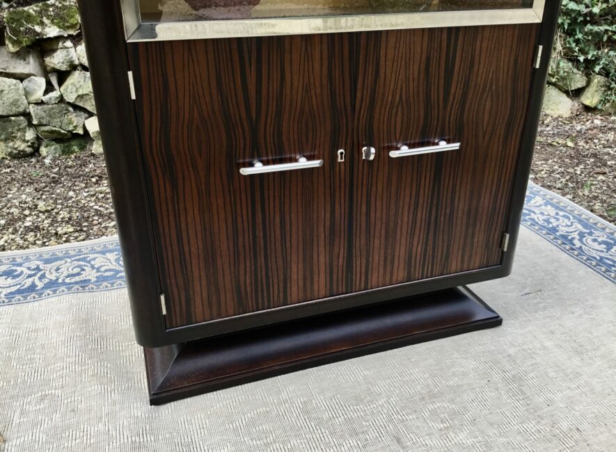 Vitrine d’époque Art-Déco en ébène de Macassar ouvrant par deux portes en partie basse et une porte vitrée avec entourage en métal nickelé en haut. Très belle qualité de fabrication pour ce meuble. Il repose sur un épais socle en doucine. À l’intérieur pour le bas une étagère réglable sur crémaillères et pour la partie vitrine, deux tablettes en verre avec un fond miroir pour mettre en valeur ce que l’on y présente. Ce meuble est en parfait état, juste quelques petites piqûres discrètes sur l’entourage en métal.